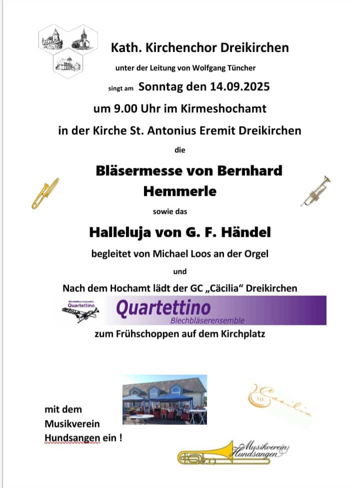 Das festliche Kirmeshochamt in Dreikirchen/WW war ein voller Erfolg. Die Kirche war vollbesetzt. Neben der zentralen Bläsermesse von Bernhard Hemmerle erklangen auch Händels Halleluja in der Orignal-Fassung sowie Werke für Blechbläserquartett und Orgel. Die Orgel spielt Michael Loos aus Hadamar. Die Gesamtleitung hatte Jürgen Tüncher.